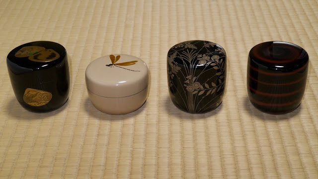 Anyway natsume do vary slightly in size and the wood from which they are made so there is perhaps no definitive answer. The small one I have that was turned and lacquered by a very respected craftsman only weighs 25g, about a sixth of the weight of an iPhone. Incidentally, the ideal weight of the pottery tea bowl used in the ceremony is said to be 300g. This is considered to be the perfect weight for the handleless bowl, which is held in both hands to drink the frothy green tea.